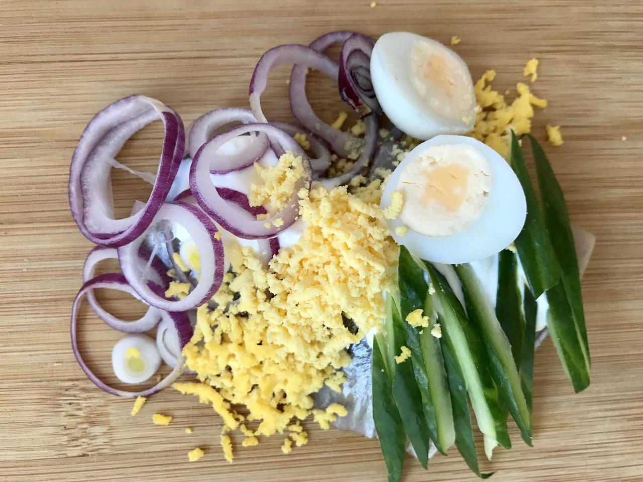 Soola heeringas*, hapukoor*, punane ja roheline sibul, keedetud muna*