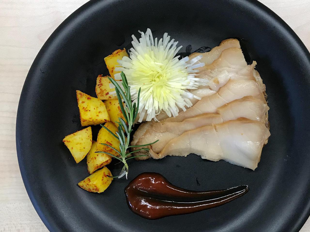Külmsuitsu võikala*, praetud kartul, safran, tomatikaste (purustatud tomat, porgand, sibul, küüslauk, ürdid)