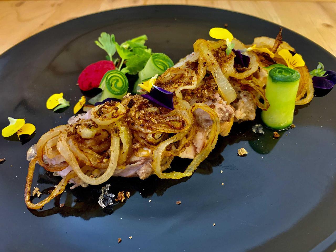 Marineeritud angersäga praetud sibula ja musta leiva puruga