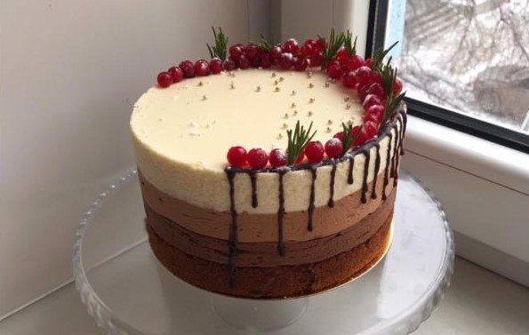 Tume biskviit, toorjuustuvaht, kolme erineva šokolaadiga.