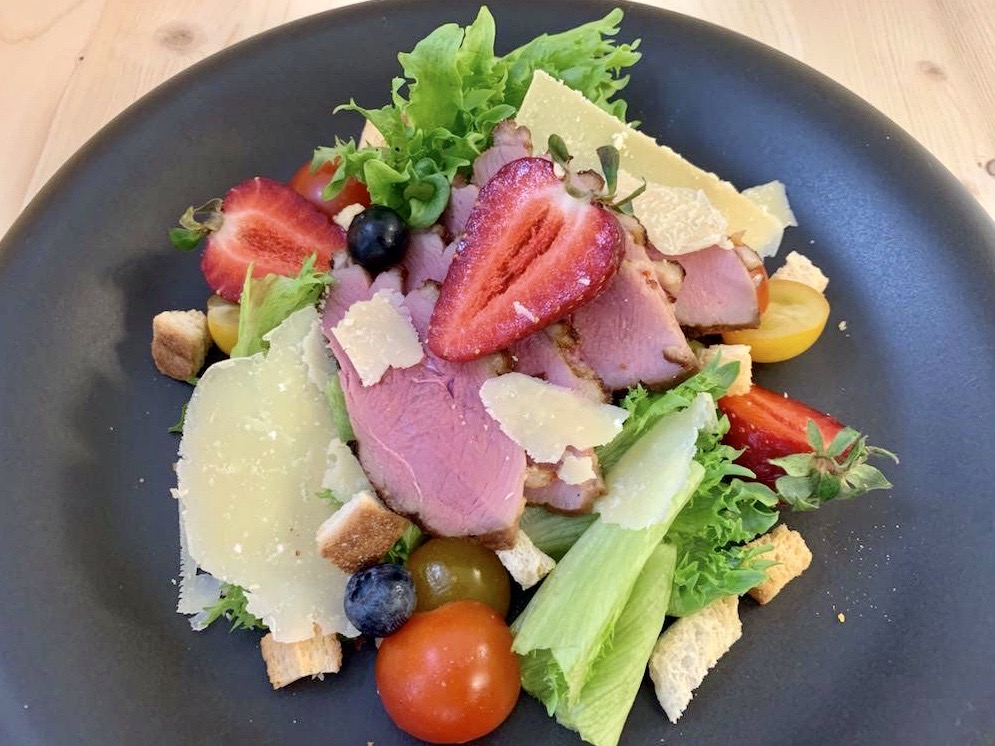Rooma salat, kirsstomat, saiakrutoonid*, parmesani juust*, pardifilee, caesari kaste (majonees*, tšilli, ingver, küüslauk, laimimahl, sojakaste*, suhkur, sool)100g