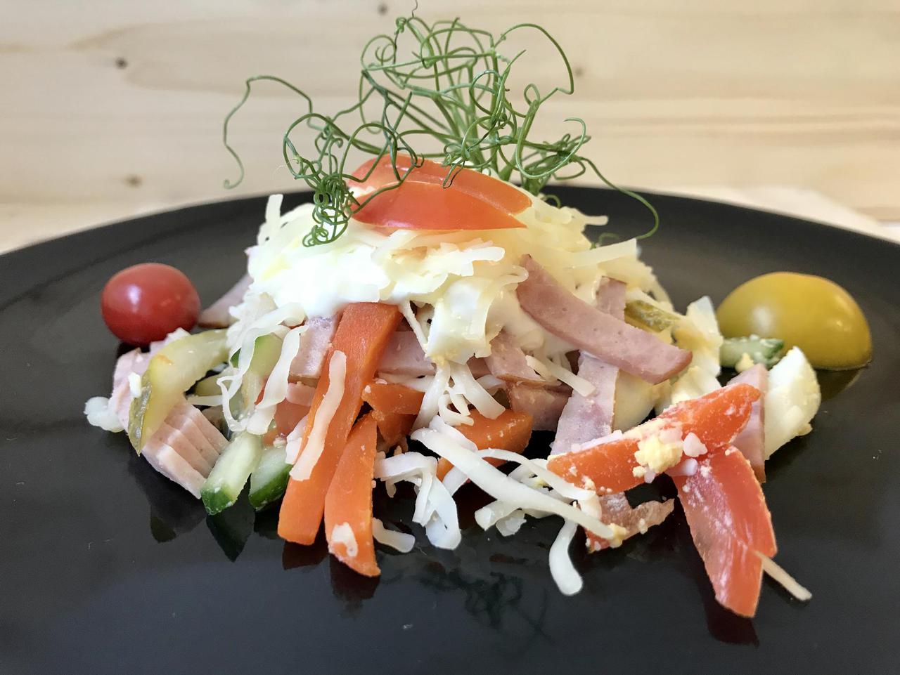 Sink, juust*, porgand, tomat, värske kurk, marineeritud kurk, õun, majonees*, hapukoor*, tomatikaste*, sool, suhkur, pipar