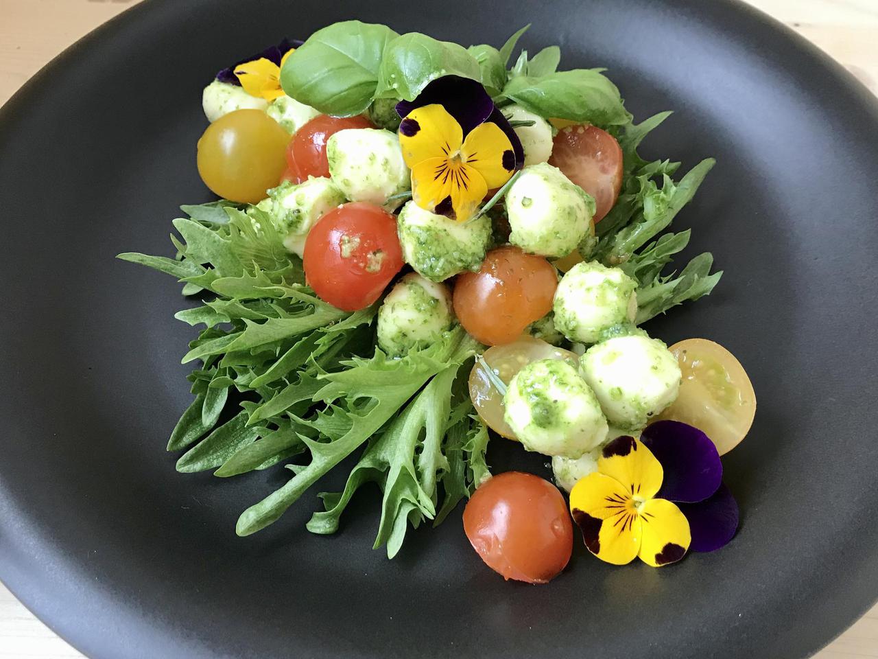 Roheline salat, kirsstomatid, mozzarella pallid*, pesto (basiilik, oliiviõli, parmesani juust*, küüslauk)