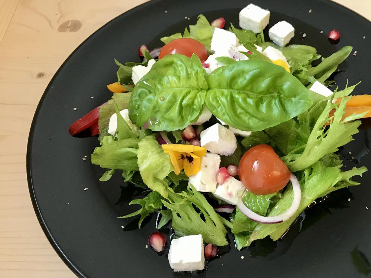 Värske lehtsalat, laimimahl, valgeveini äädikas, mesi*, feta juust*, ürdid, sool, õli
